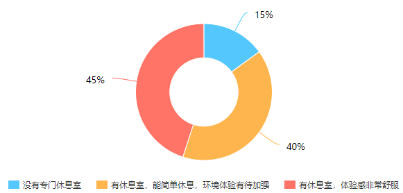 对于休息室的设置及管理得到大比例的认可,说明这一环节的设计与建造标准都取得了巨大的提升。一些好的案例应该得到推广和提升。