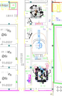 占地面积大,拥有一套MRI复合手术室(手术室+磁共振检查室),一间DSA复合手术室,因为设备机房阻挡,DSA复合手术室不能和MR复合手术室直接相通。方案优化可以做成一个磁共振检查室拖两间手术室(改动MR设备间位置,但调整设备间对原手术区布局方案影响大)。