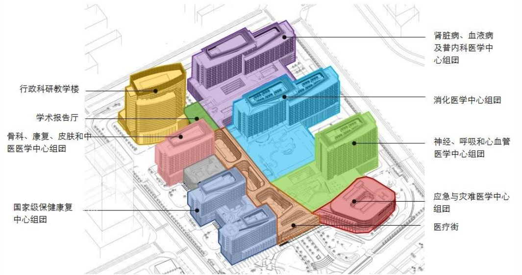 二期项目在医疗规划上开创性地采用了以病种为中心的多中心组团布局模式,整体规划为“6+1”的组团分布布局。各医疗组团内,门诊形成模块化共享模式,服务组团内所有科室;医技和住院功能针对科室整体布局,以多学科联合诊疗模式(MDT)为支撑,借助智慧药房、智能物流传输等系统,“一站式”解决患者需求。